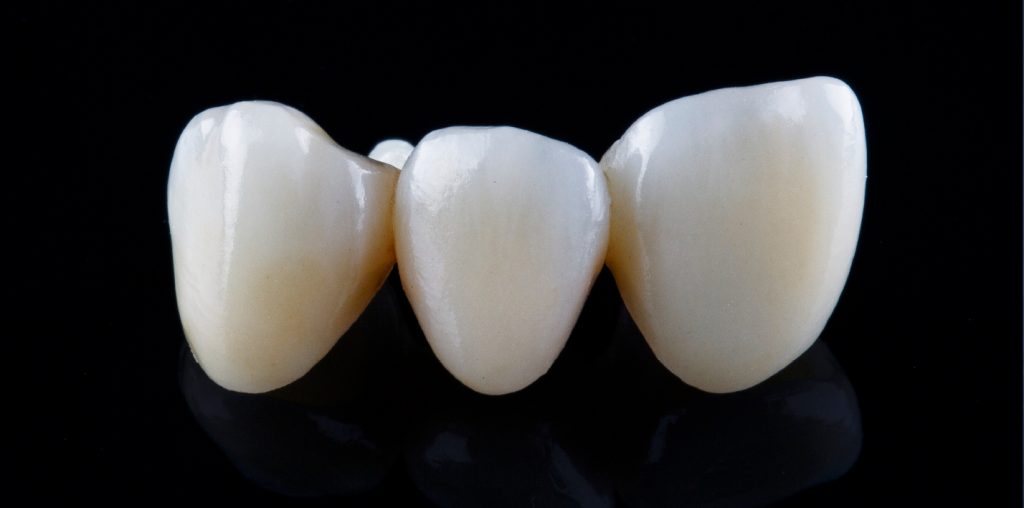 They are typically formed of one or more pontics (false teeth) with crowns attached at either end. These end crowns are fitted on top of the adjacent teeth to hold the bridge in place and allow the pontics to sit securely on the gum-line in the space between.
